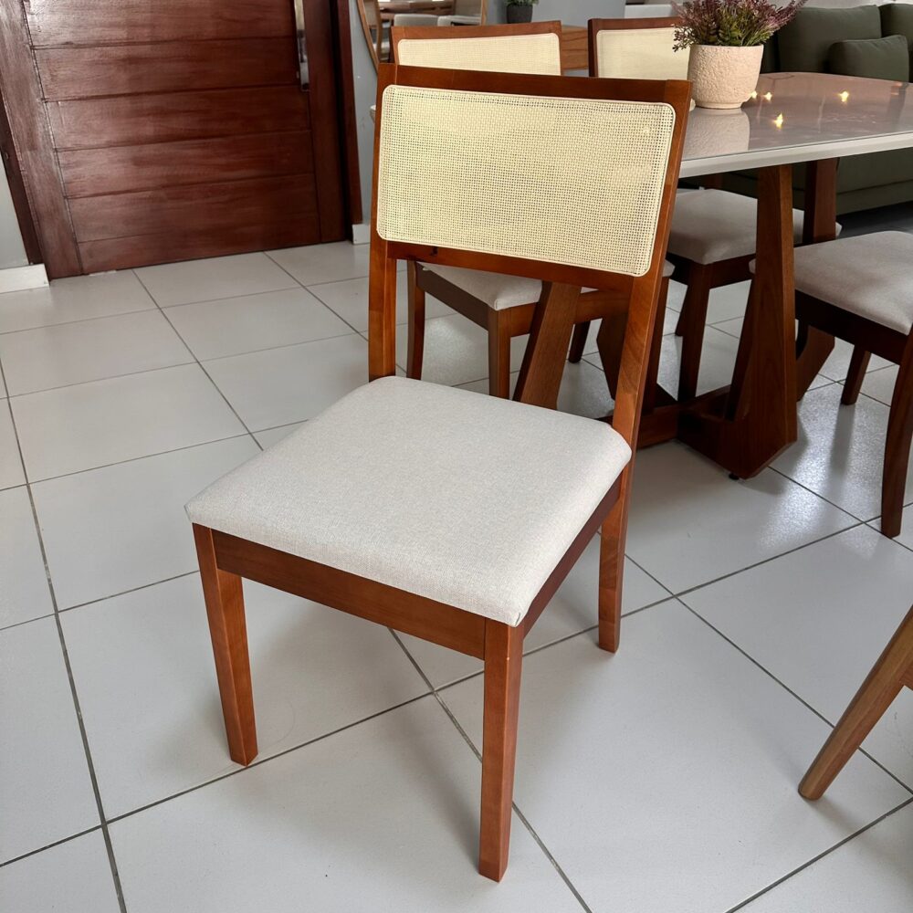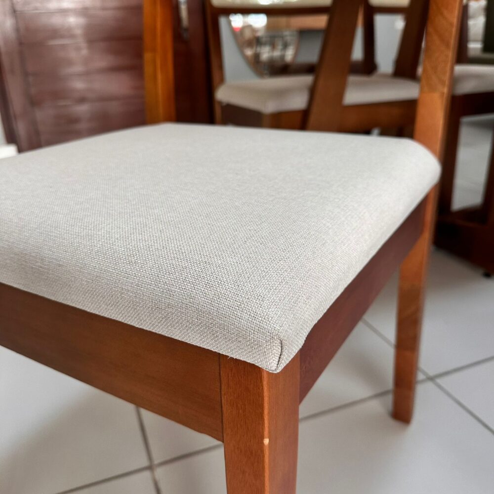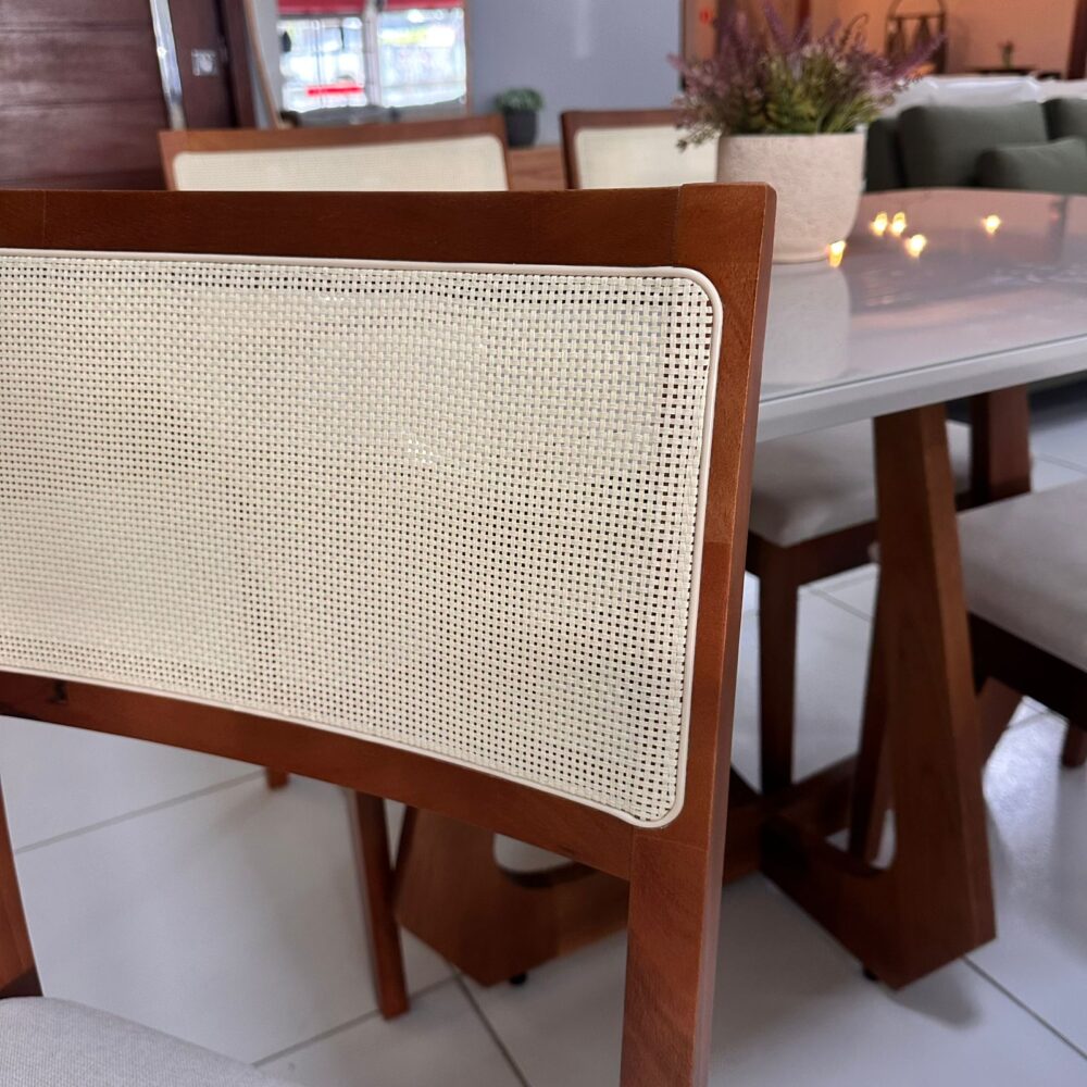Encosto em telinha e assento no revestimento em linho.