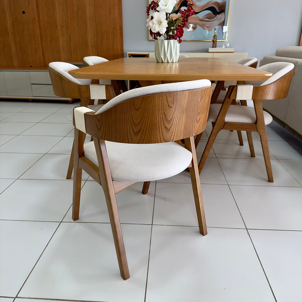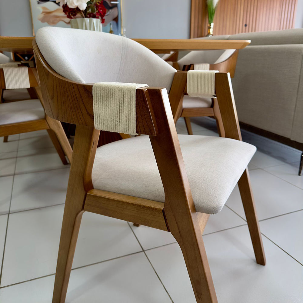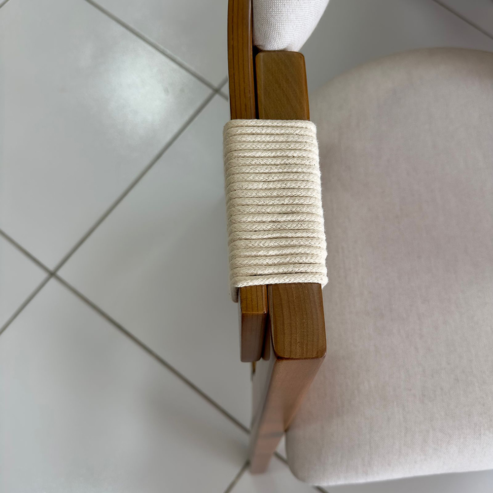 revestimento em linho, estrutura em 100% madeira e braços com detalhe em corda