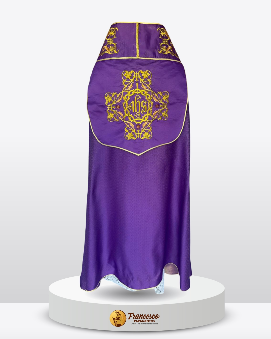 Confeccionada com tecidos de alta qualidade, a Capa Glória do Nome de Jesus apresenta bordados finos e simbólicos, frequentemente evidenciando o monograma “IHS”, que representa o Nome de Jesus e convida à contemplação e devoção. Seu acabamento primoroso e design harmonioso proporcionam elegância e solenidade às celebrações litúrgicas.