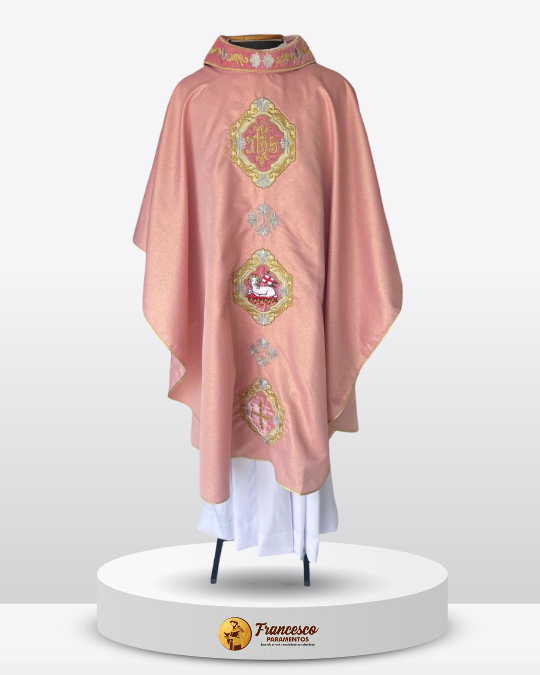 A Casula Três Medalhões – Róseo é uma peça litúrgica que une beleza, simbolismo e delicadeza, expressando a alegria e a esperança características dos momentos especiais da liturgia. Na tonalidade rósea, é especialmente indicada para os domingos Gaudete e Laetare, quando a Igreja convida os fiéis a uma pausa jubilosa no caminho de preparação.