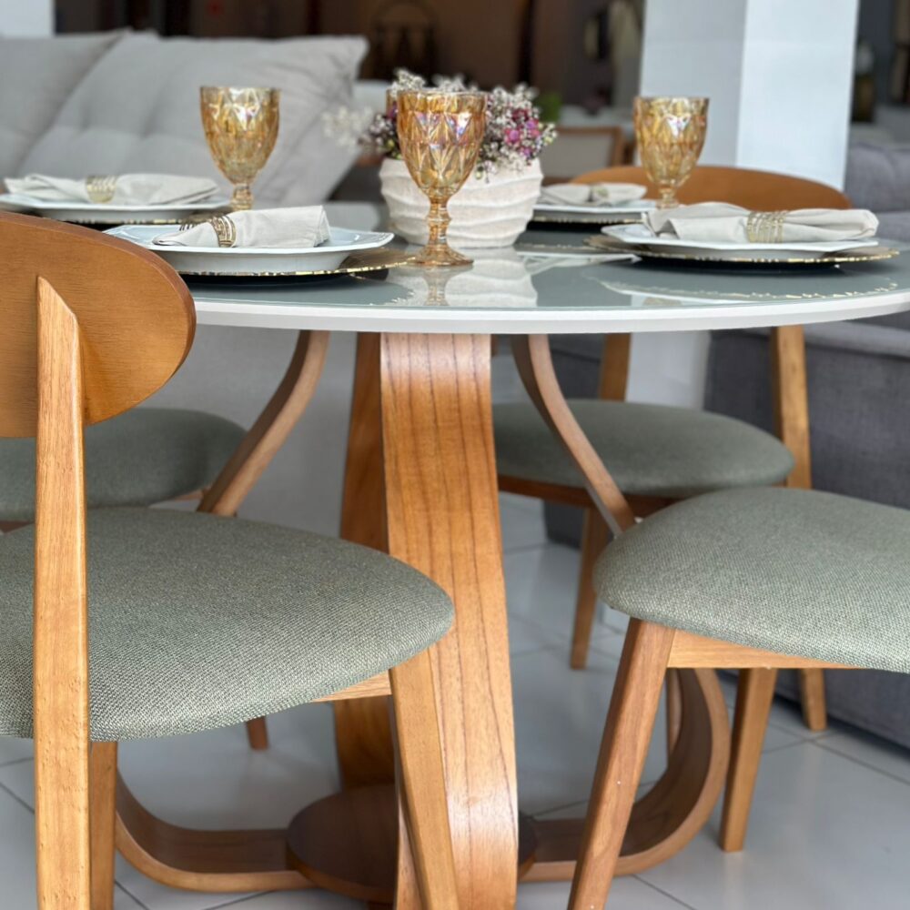Acabamento: Tampo com vidro sobreposto, base no formato cebola super elegante;