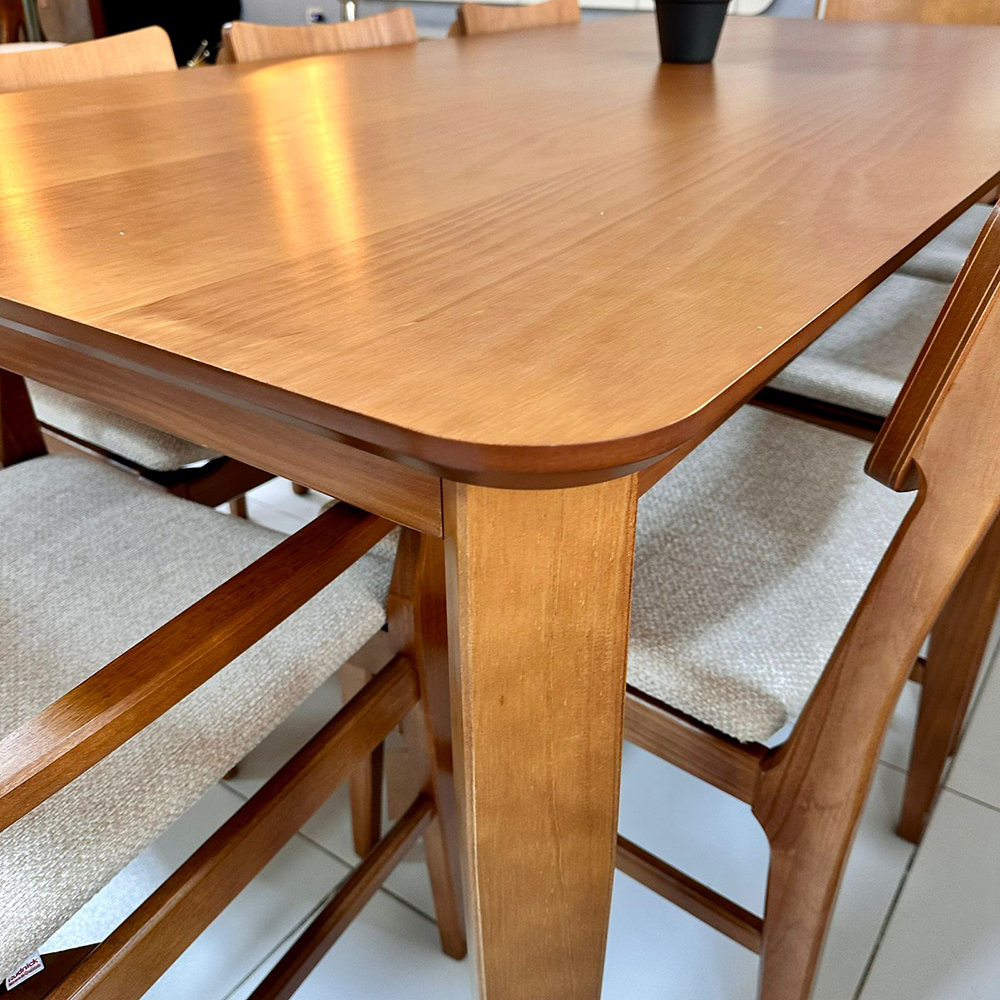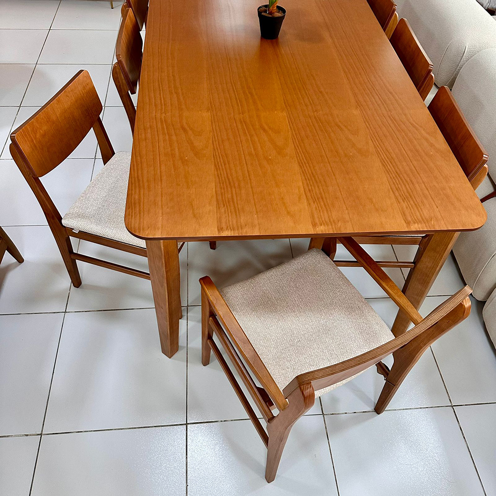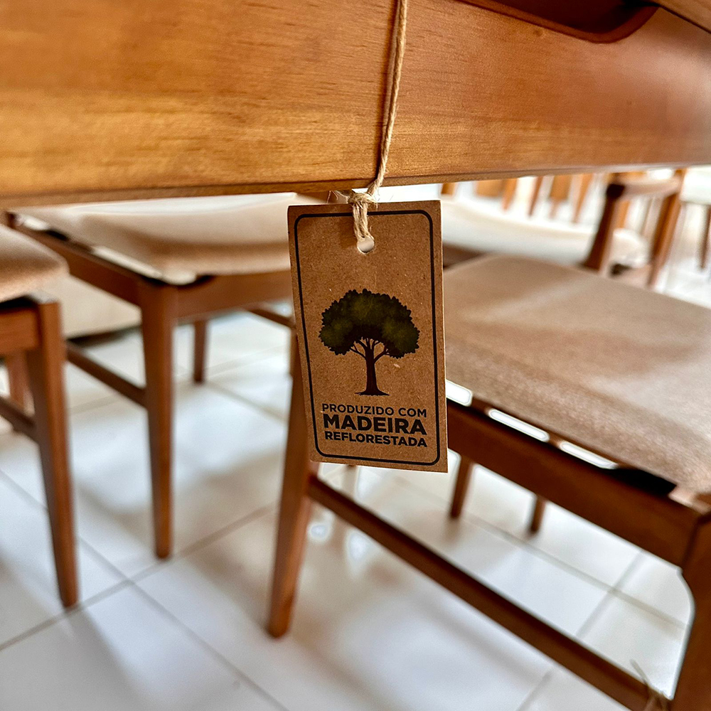 8 cadeiras 100% madeira com encosto laminado e assento no revestimento de linhão
