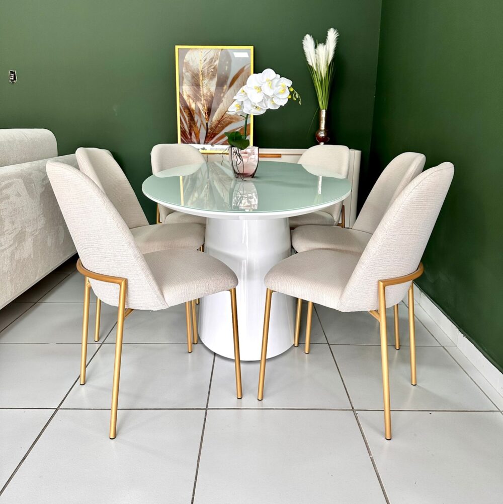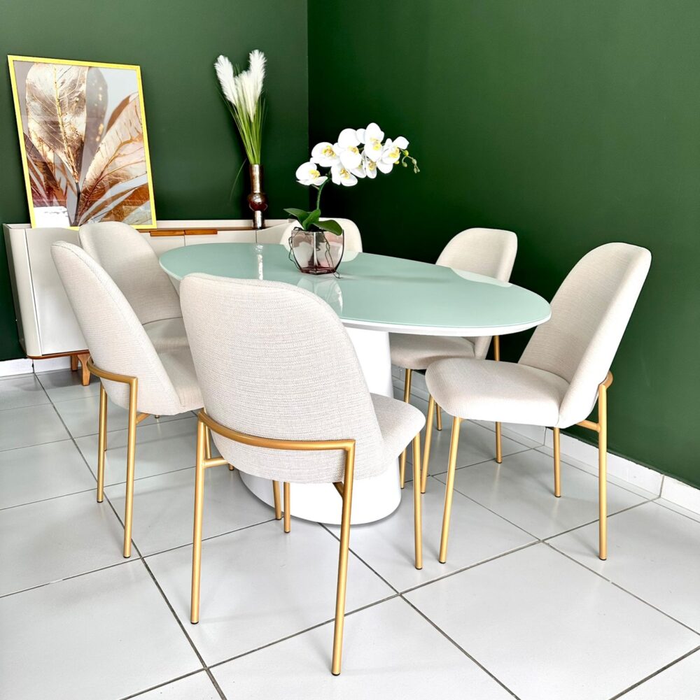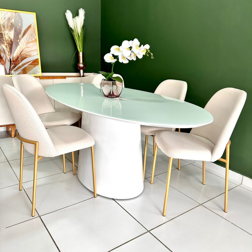 Laqueado, vidro sobreposto, base seguindo o mesmo padrão da mesa