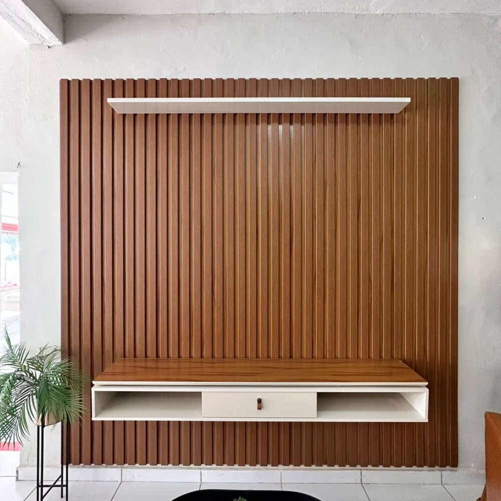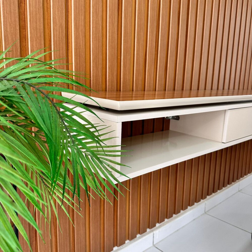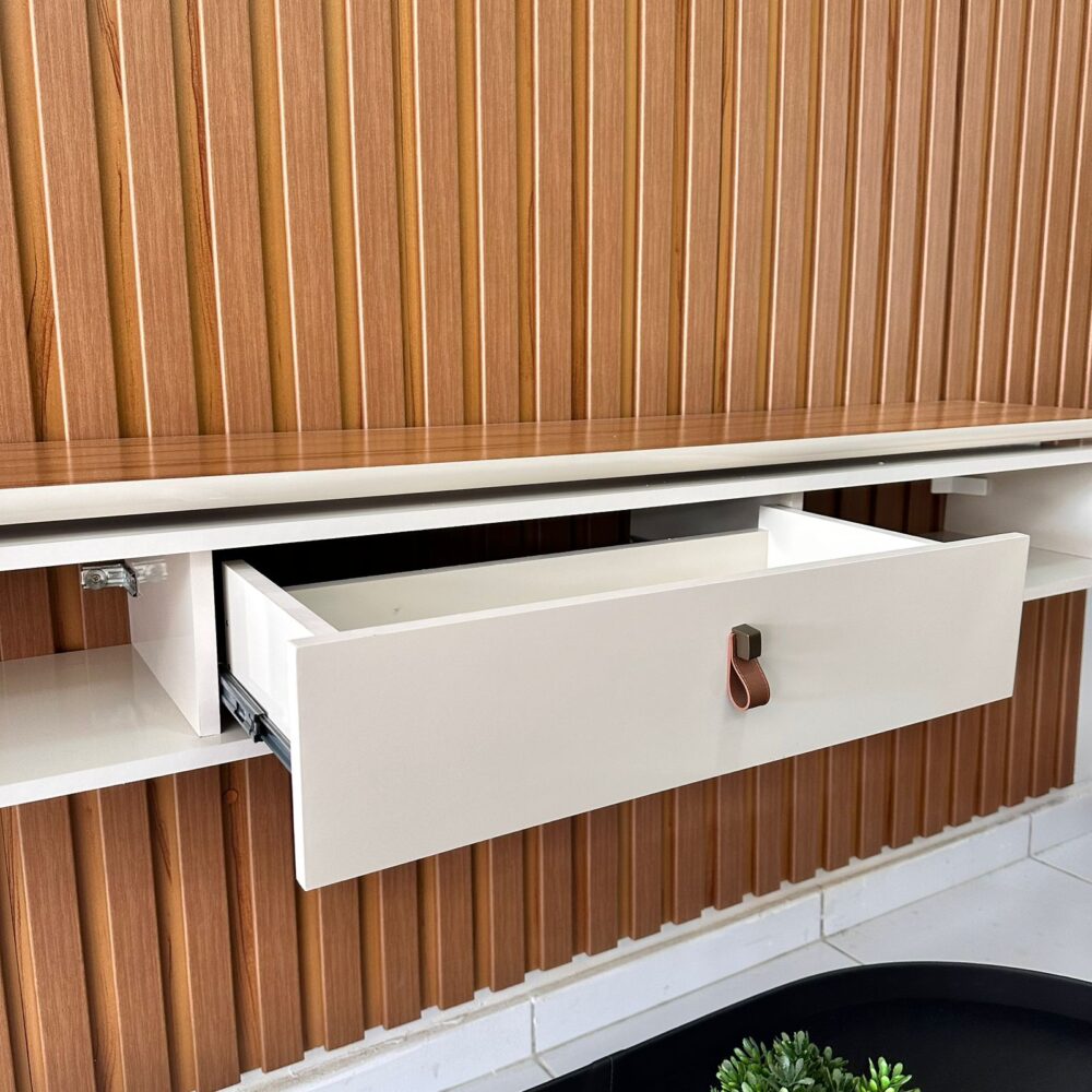 Em ripado, prateleira pra organização, nicho gaveteiro medindo 1.60 com tampo flutuante e gaveta com corrediça telescópica