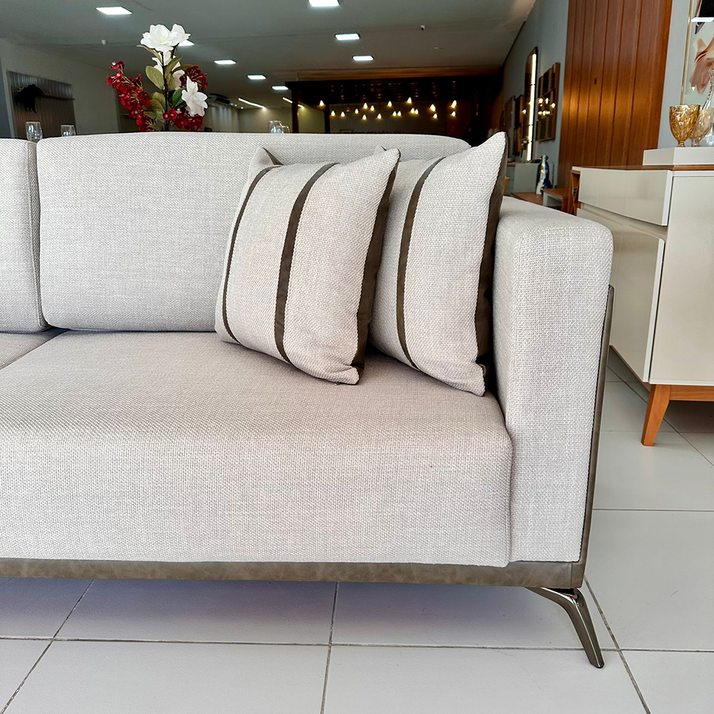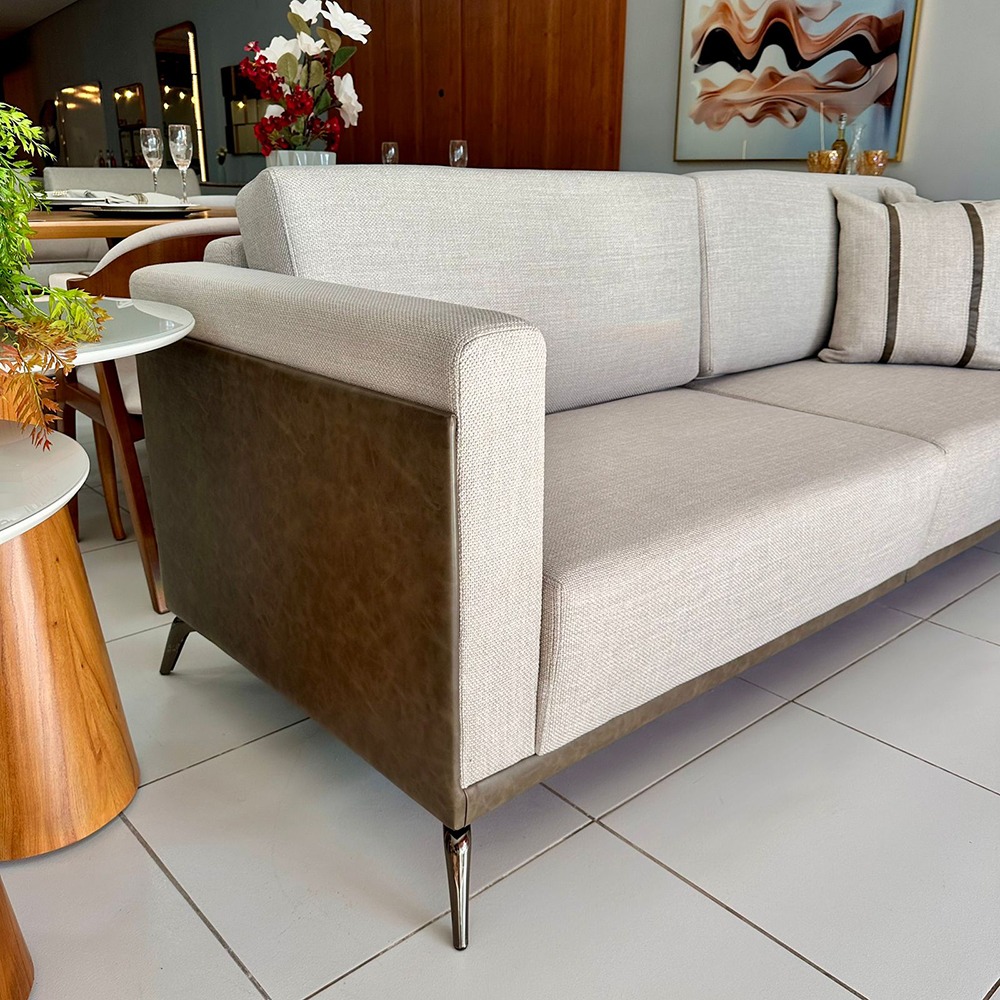 sofá no modelo living, pés em aço carbono; design elegante e moderno